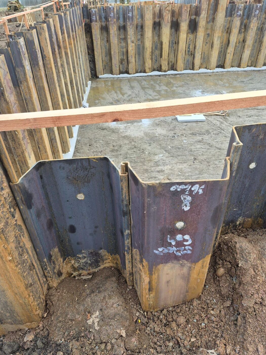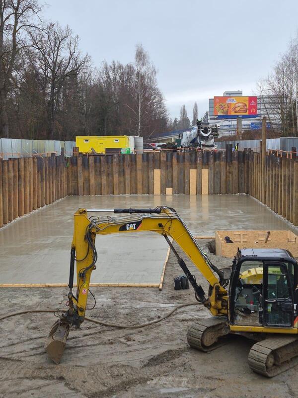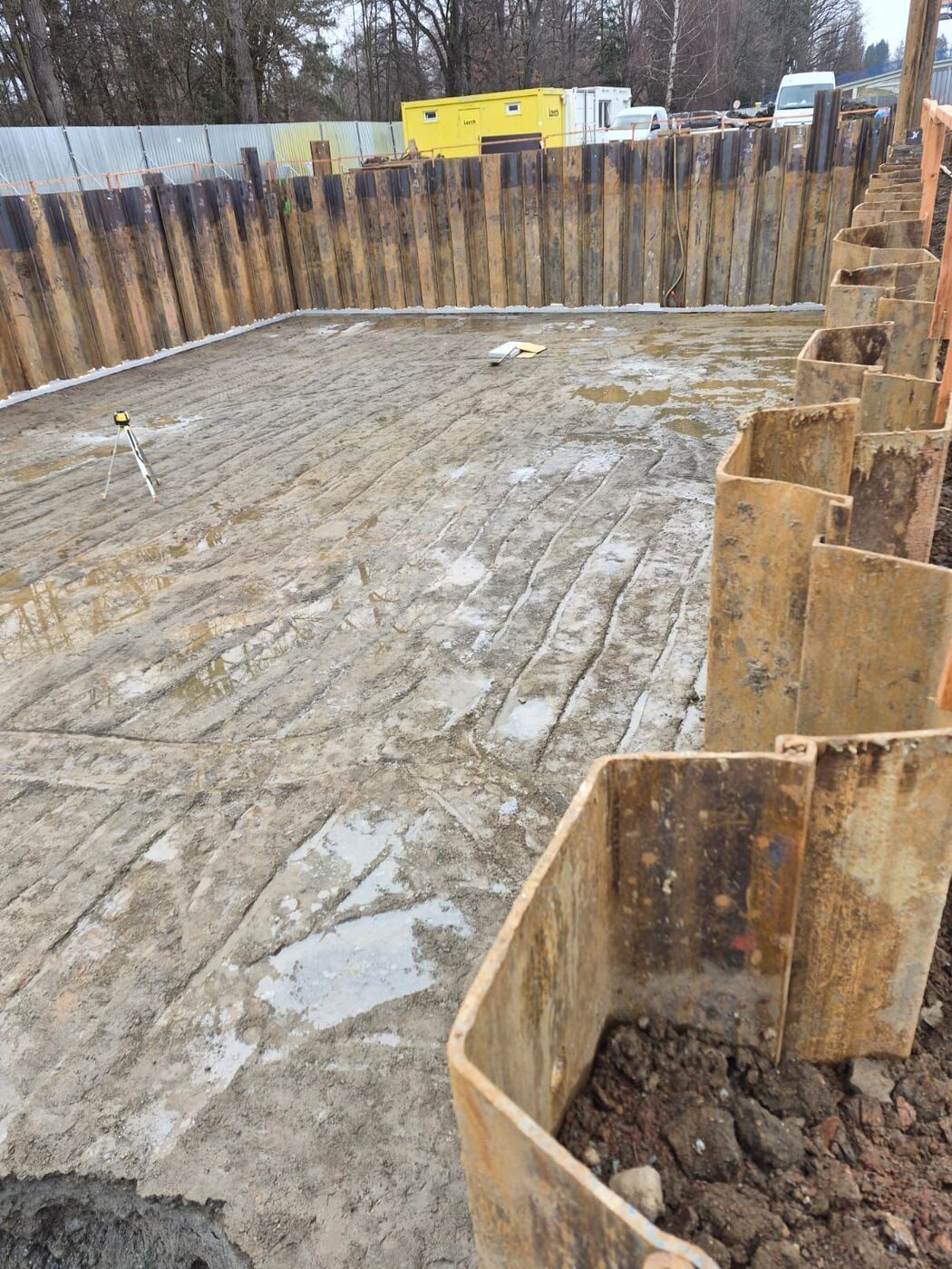 Byla kompletně dokončena stavební jáma v požadovaném rozsahu a hloubce. Následně proběhla statická zátěžová zkouška základové spáry, která potvrdila vyhovující únosnost podloží dle projektové dokumentace. Výsledky zkoušek splnily všechny předepsané parametry, což nám umožňuje pokračovat v dalších fázích realizace. V současné době probíhá bednění “šalování” okrajů výkopu, které bude sloužit jako jedna strana bednění pro navazující betonáž vodostavebního betonu. Tento krok je důležitý pro zajištění přesného tvaru a stability budoucích nosných konstrukcí. Pro pevnější, rovnější a čistější pracovní plochu si dno výkopové jámy vybetonujeme podkladním betonem.