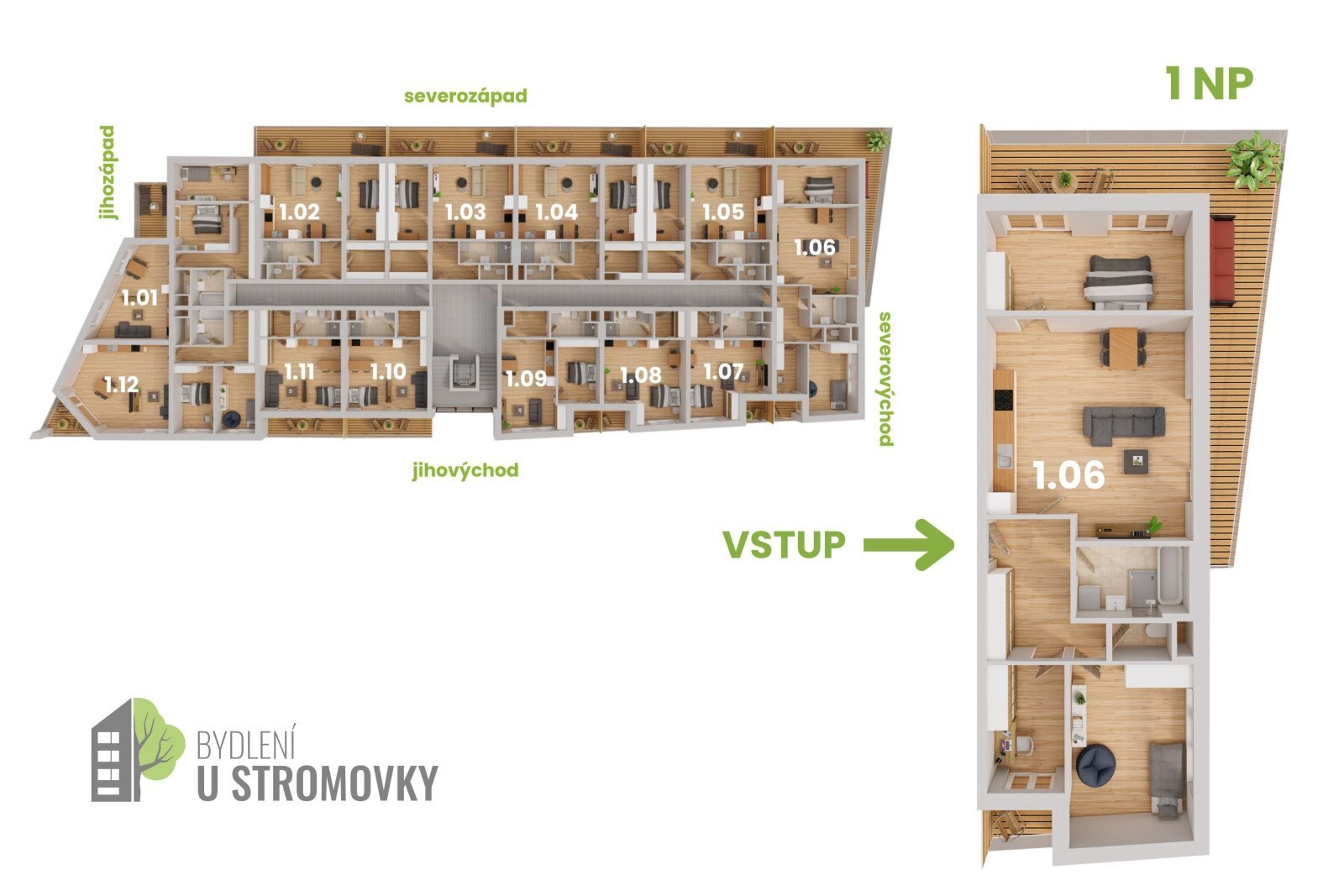 Bytová jednotka č. 1.06 o dispozici 3+kk a podlahové ploše 119,23 m² se nachází v 1.patře a zaujme balkonem orientovaným do zeleně a lodžií směrovanou na jihovýchod. Interiér je navržen s důrazem na světlost, praktičnost a celkový komfort bydlení. Každý byt má klimatizaci v obytných místnostech, vlastní sklepní kóji, lodžii, balkon nebo terasu a možnost garážového či venkovního parkovacího stání.