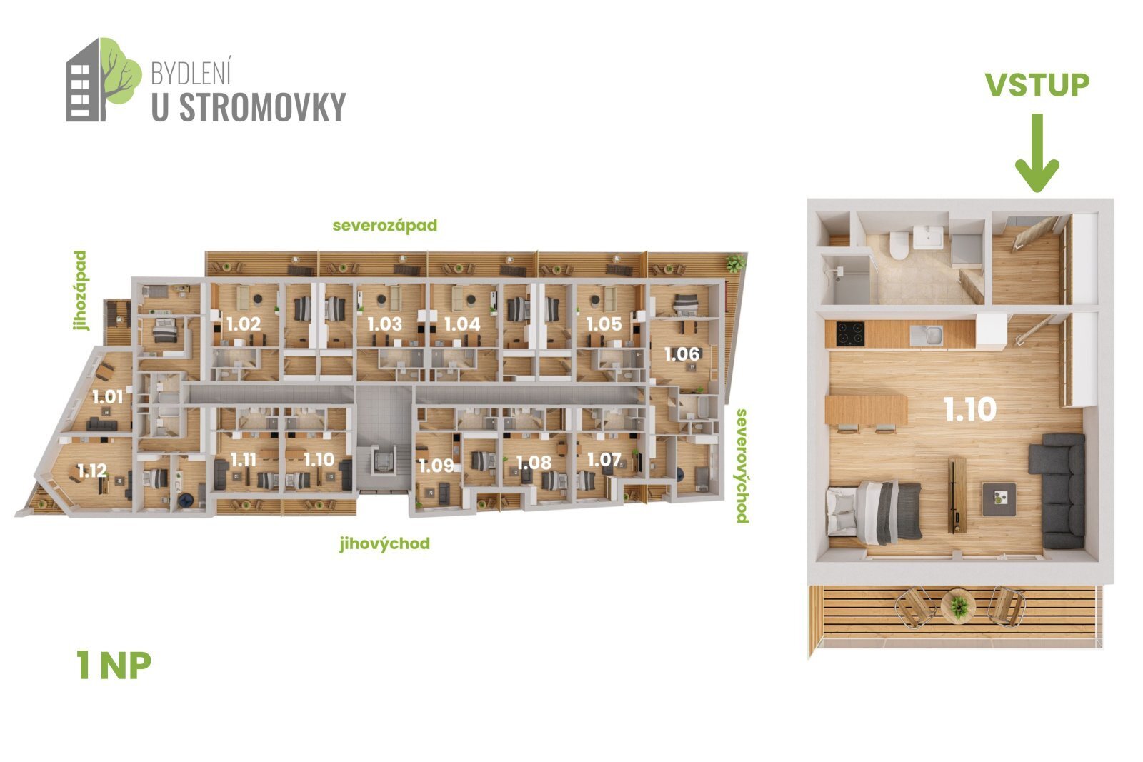 Bytová jednotka č. 1.10 o dispozici 1+kk a podlahové ploše 49,09 m² se nachází v 1.patře a zaujme lodžií orientovanou na jihovýchod. Interiér je navržen s důrazem na světlost, praktičnost a celkový komfort bydlení. Každý byt má klimatizaci v obytných místnostech, vlastní sklepní kóji, lodžii, balkon nebo terasu a možnost garážového či venkovního parkovacího stání.