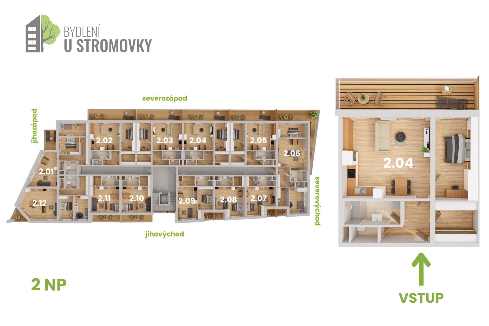 Bytová jednotka č. 2.04 o dispozici 2+kk a podlahové ploše 76,28m² se nachází ve 2.patře a zaujme balkonem orientovaným do zeleně. Interiér je navržen s důrazem na světlost, praktičnost a celkový komfort bydlení. Každý byt má klimatizaci v obytných místnostech, vlastní sklepní kóji, lodžii, balkon nebo terasu a možnost garážového či venkovního parkovacího stání.