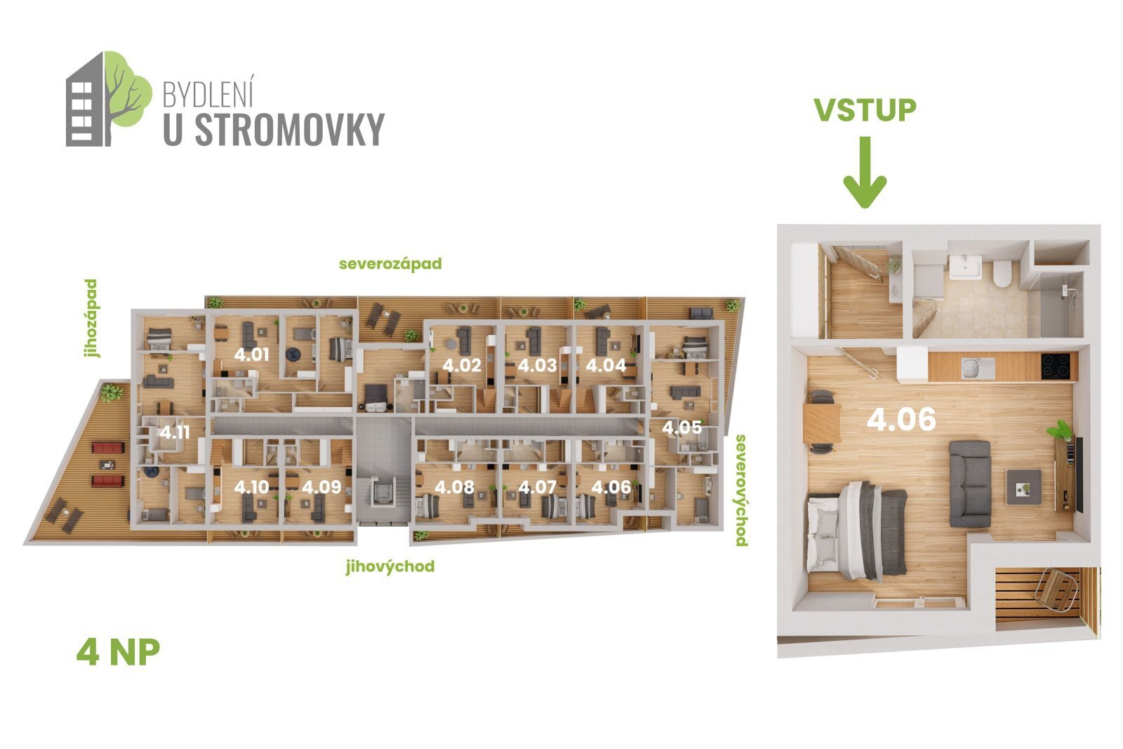 Bytová jednotka č. 4.06 o dispozici 1+kk a podlahové ploše 39,79m² se nachází ve 4.patře a zaujme terasou orientovanou na jihovýchod. Interiér je navržen s důrazem na světlost, praktičnost a celkový komfort bydlení. Každý byt má klimatizaci v obytných místnostech, vlastní sklepní kóji, lodžii, balkon nebo terasu a možnost garážového či venkovního parkovacího stání.