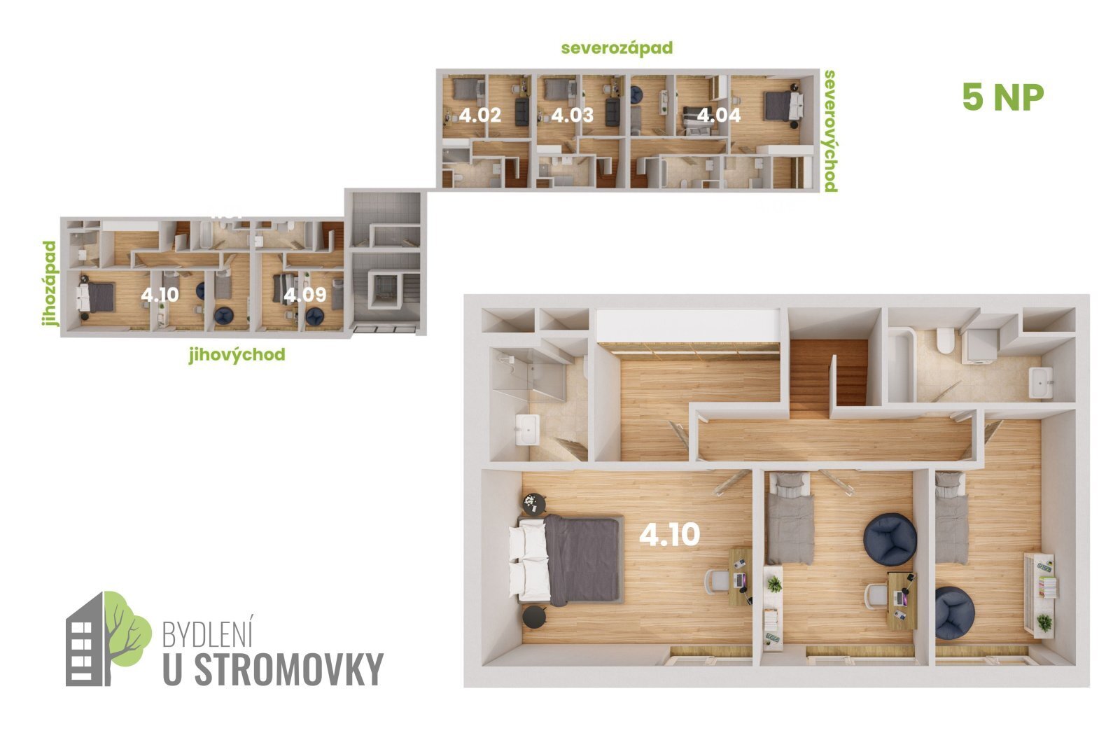 Bytová jednotka č. 4.10 o dispozici 4+kk mezonet a podlahové ploše 124,24m² se nachází ve 4.patře a zaujme terasou orientovanou na jihovýchod. Interiér je navržen s důrazem na světlost, praktičnost a celkový komfort bydlení. Každý byt má klimatizaci v obytných místnostech, vlastní sklepní kóji, lodžii, balkon nebo terasu a možnost garážového či venkovního parkovacího stání.